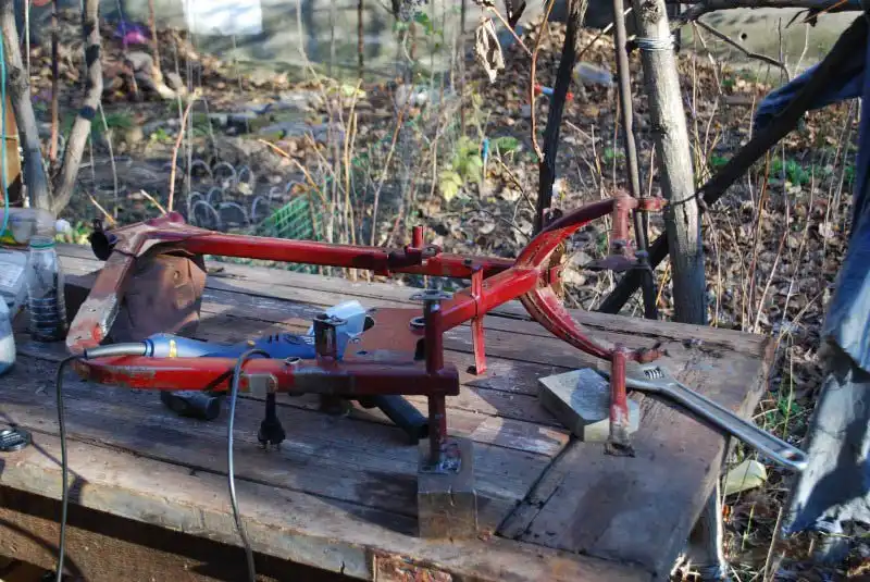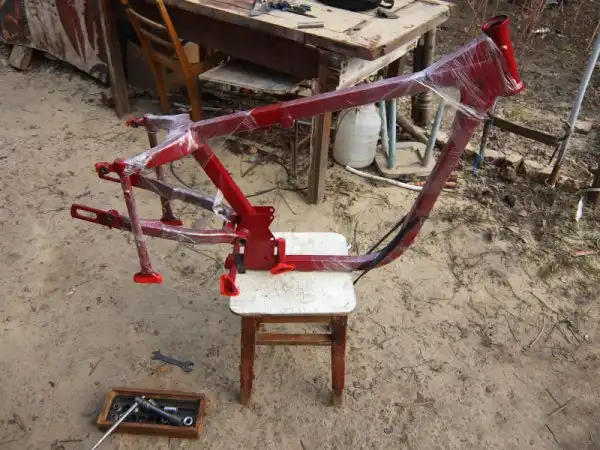 Предыдущий владелец использовал этот мотоцикл «и в хвост и в гриву», для поездок на рыбалку. Грязи на нём было немеренно. Разобрав второй мотоцикл я понял, что он ушатан ещё больше, чем первый, перед моими глазами оказалась треснутая и поведённая рама (это было самым большим огорчением за весь процесс восстановления). Делать нечего, нужно править и ремонтировать раму. На это ушло около 7 дней, а точнее вечеров. В итоге всё было сделано, рама выправлена, обварена накладками, зашпаклевана и покрашена. Начало положено.