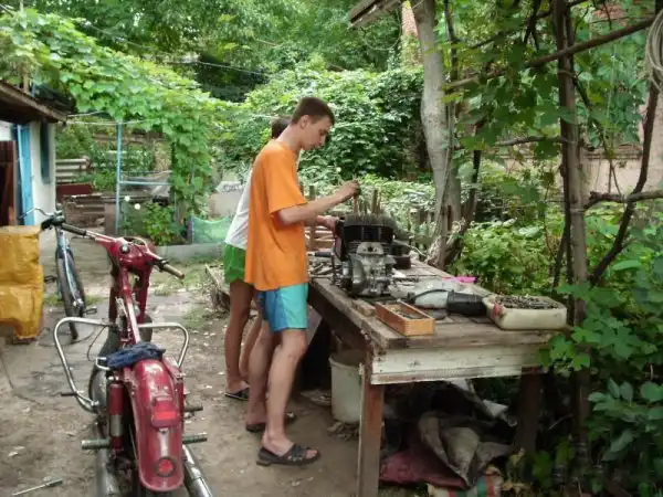 Потом сессия, я мало подходил к мотоциклу, за этот период успел приобрести донора – раму и двигатель с документами, как позже оказалось рама левая, документы есть только на двигатель, обманул меня барыга поганый. Потом сборы, за ними отдых на море, так прошло лето. Как говориться, «первым делом, первым делом – мотоциклы, ну а девушки, а девушки на них», следуя этой мудрой мысли, приехав с моря, я наконец добрался к своей Старушки. На тот момент у меня был мотоцикл, рама и ещё один мотор. В виду вылетающей 2 и 3 передачи было решено снять нерабочий двигатель и поставить второй на его место, с этим я провозился пару дней, поставил мотоцикл на уверенный ход и в таком виде прокатался пару месяцев.