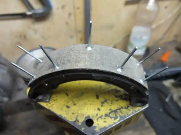 Так же необходимо было отполировать барабаны колёс, поменять в них подшипники, заменить накладки и собрать колёса обратно. С накладками отдельная история, я думаю всем понятно что шляпка заклёпки должна быть утоплена в накладку чтобы не тереть барабан, так как я клепал обратными заклёпками, утопить их было не так просто, для этого был изобретён хитрый способ, между заклёпкой и пистолетом прокладывалась гаечка, в итоге получался хороший результат. Тренировался спицевать я на старых спицах и на старом ободе, после двух попыток, я перешел к спецовке основных колёс, первое мне тяжело давалось, видать обод был немножко кривоват, но всё же я его довёл до нужной кондиции, с вторым было по проще, на всё я потратил часа 3 — 3.5.