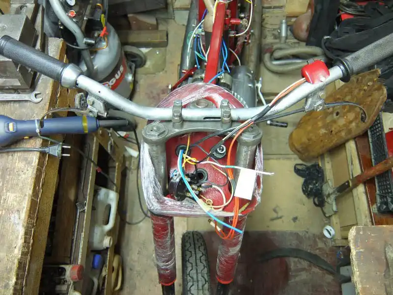 Работаю я один так что пришлось изобретать изощренные методы установки двигателя на раму, такие что бы не повредить спину. Я облегчил двигатель как смог и используя русский словарь мата водрузил его на место. Далее предстояло прокладывать проводку, по скольку оригинальную проводку найти очень сложно и очень, очень, очень дорого, я купил кучу разноцветных проводов, горсть коннекторов и обжимной инструмент.