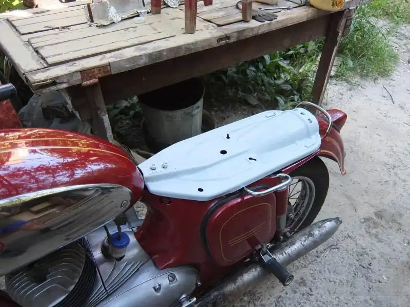 С сиденьем особых проблем не было, благо отлично сохранилась микропорка («поролоновая» основа сиденья) а вот станину (металлическую основу) пришлось ремонтировать. Отремонтировав станину, я созвонился с человеком и отправил всё это добро в Анапу, там дядя Коля должен был обшить мою сидушку по всем канонам Явы. Вообще обшив сиденья Явы спорный вопрос, за много лет было много разных модификаций, некоторый люди утверждают что были канты, некоторые шьют белыми нитками, в общем существует много споров, но все они затихают когда на свет появляется оригинальное сиденье тех времён, все замолкаю и пускают слюни глядя на неё. Дядя Коля в своем арсенале имеет практически все оригинальные сидушки и шьет так как надо. Сиденье обшили, и оно вернулось ко мне. На почту я приехал его забирать сидя на крыле, пока ехал проклинал дороги, копчик мой был в шоке от таких поездок. Так вот, забрал сидушку, установил, сель и поехал, и тут меня ждало самое страшное приключение. В виду того что дерматин был ещё свежим и новым, я немного скользил на нём, давал газу и сползал назад, тормозил соответственно сползал к баку. Представьте себе как вы едите на такой сидушки, примерно 60 км/ч, и тут резко с остановки выворачивает маршрутка(в Ростове маршрутчики делают что хотят, что такое сигнал поворота они наверно вообще не знают, а мотоциклистов за комаров наверное считают) так вот этот упырь решил вывернуть, а тут я, делать нечего, начинаю резко оттормаживаться, соответственно скольжу к баку ииииииии со всего маху пытаюсь лишить его девственности… уууууу, как же больно… приехал домой протёр сидушку, проблема исчезла.