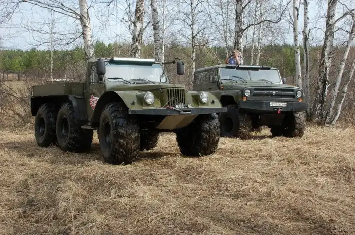 Мы говорили, что будущий вездеход мог бы быть плавающим, однако такая возможность не была принципиальной — получалась бонусом от использования пневматиков низкого давления. Водоемы в тех краях редкость, а во время таяния снегов, когда ручьи становятся полноводными, в полях-болотах делать особо нечего. Поэтому и за массой машин создатели особо не гнались, не выгадывали каждый килограмм. «Двухосник» без силовых бамперов и части салонного оборудования тянул на 3,5 т, и, кстати, тогда на воде держался. Сейчас авторы в этом сомневаются, хотя опытным путем плавучесть потяжелевшего вездехода еще не проверяли. «Трехосник» на полтонны легче и плавает — сказывается наличие двух дополнительных водоизмещающих элементов, то есть колес. А как ездят оба?