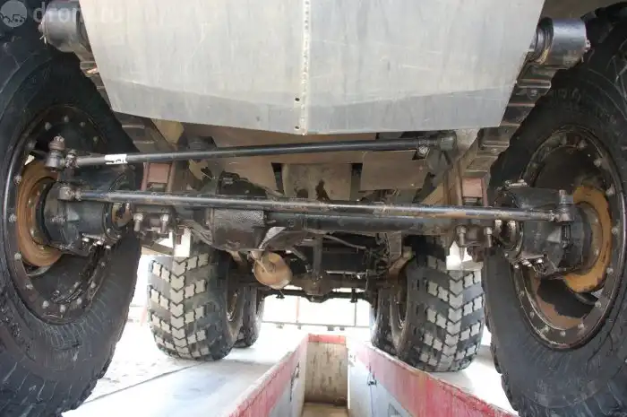 Мосты также выбирались по финансовым соображениям — уазовские военные. К тому же, как считают авторы, даже при колесах диаметром 1300 мм (использовались те же арктиктрансовские) пренебрегать лишними сантиметрами дорожного просвета не стоит. «Грибки» (короткие полуоси в бортовых редукторах) сворачивает, но это явление, как известно, сильно зависит от манеры вождения. И от передаточных отношений «понижайки» — чем они больше, тем выше шанс избежать жестких ударов в трансмиссии, проходя препятствия внатяг