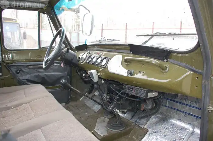 В кабине «трехосника» никаких комфортных выкрутасов — все предельно просто, по-уазовски. Грузовик, что с него взять. В кузовке есть лавки, однако использовать их «без вреда для здоровья» можно лишь на болотистых равнинах, где отсутствует «пересеченка». Держаться-то не за что, хотя трясет в кузове меньше, чем в кабине