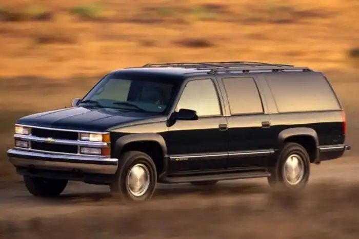 В 90-х годах жители России, конечно, уже слышали о том, что в Северной Америке любят большие автомобили. Кто-то уже познакомился с такими вживую, другим даже удалось поездить. Но когда на наших дорогах появился Chevrolet Suburban (уже девятого поколения!), то многие поняли, что значит настоящий полноразмерный «американец», к тому же внедорожного типа. Да, длина нешуточная — 5,6 метра! В стандартный советский гараж он бы не влез. В багажном отсеке предусмотрены дополнительные складные сиденья, но даже в случае их использования остается немало место для поклажи. Под стать и двигатели: бензиновый V8 объемом 5,7 л с системой центрального впрыска развивал мощность 250 л.с., и совсем уж «чумовой» исполин объемом 7,4 л мощностью 290 л.с. Грузоподъемность соответствующая — более тонны, а допустимая масса буксируемого прицепа составляла без малого три тонны.