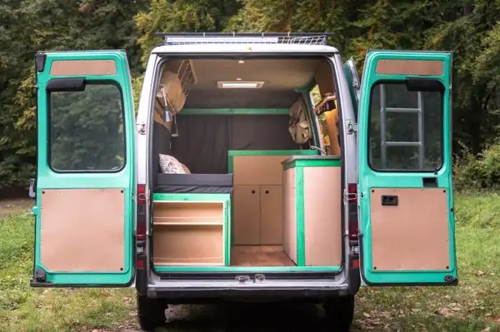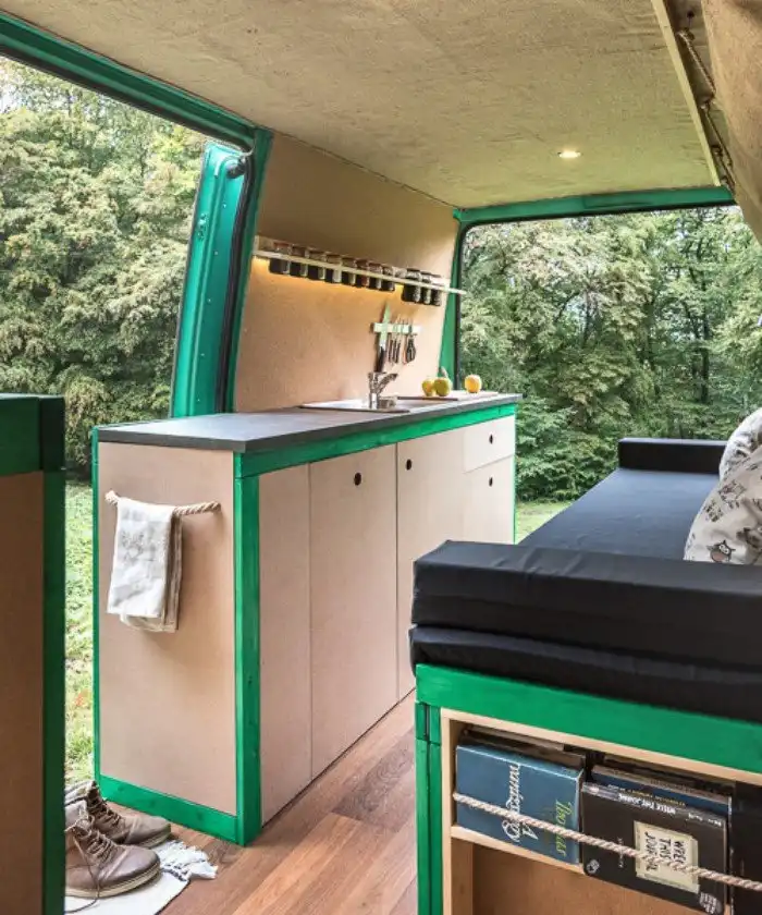 Системы водо- и газоснабжения чрезвычайно просты в использовании. Здесь есть 11-килограммовый газовый баллон, соединенный с плитой, и 70-литровый резервуар для воды, который подключен к водопроводному крану с насосом, срабатывающим от давления. Дополнительное место подключения позволяет быстро принять душ сзади фургона.