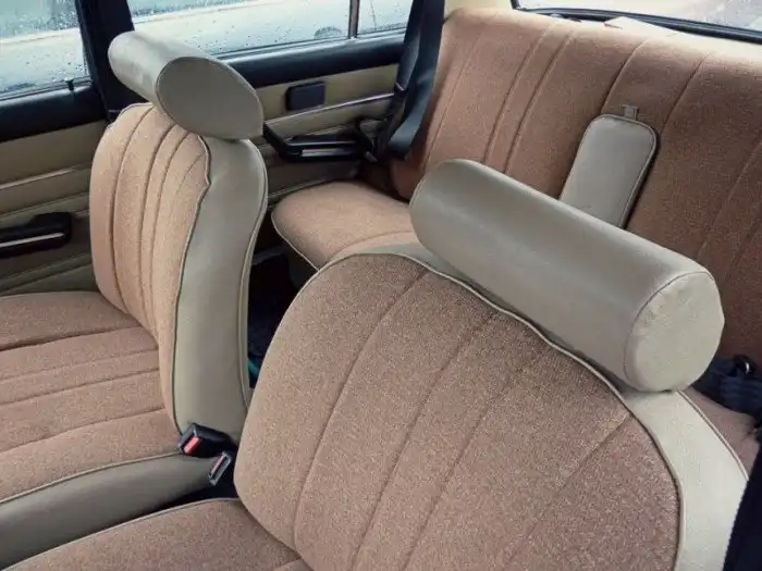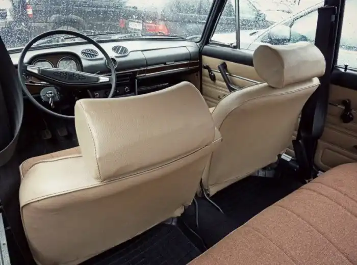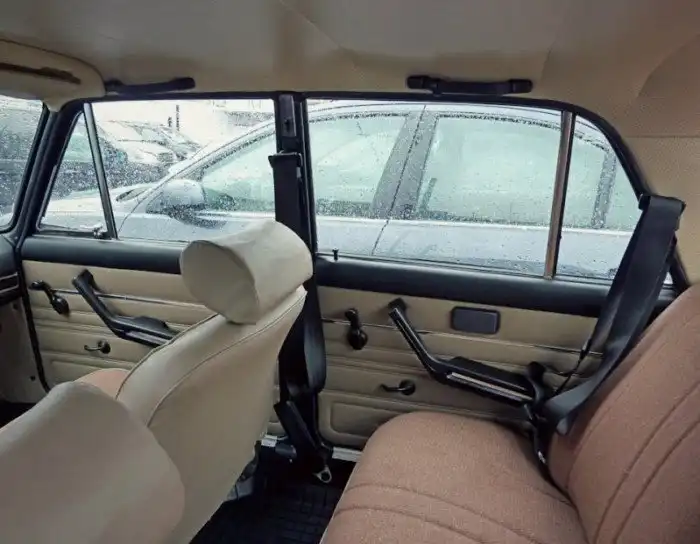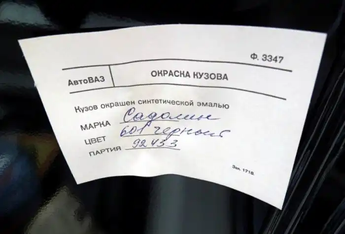На внутренней стороне крышки багажника отлично сохранилась бумажная бирка с названием краски: это импортный Sadolin, номер 601. Примечательно, что черный цвет кузова сочетается со светло-бежевым тканевым салоном, который нечасто встречается на "шестерках": практически эксклюзивная комбинация.