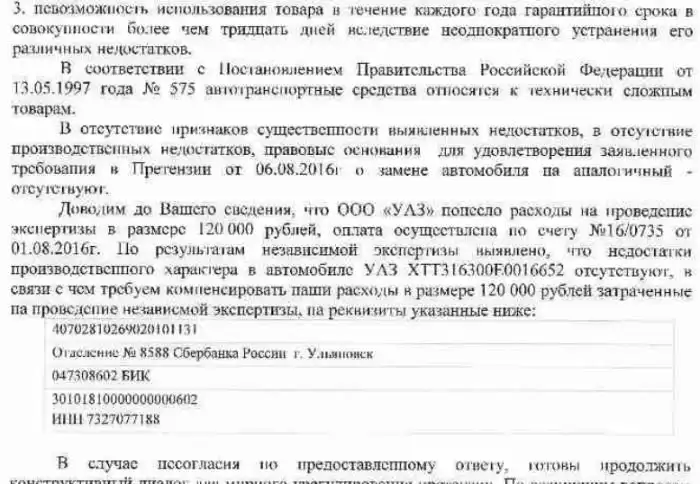 Россиянин Алексей Чучмарев с прошлого года судится с Ульяновским автомобильным заводом из-за того что у него сгорел автомобиль «УАЗ Патриот». В июне прошлого года Алексей с сыном отправился на своем еще гарантийном внедорожнике на речку, по пути машина забуксовала, после чего начала дымиться и вспыхнула. За 15 минут авто выгорело полностью, Алексей с сыном успели выбежать из салона, а внутри авто остались деньги, документы и видеорегистратор. Заказанная потерпевшим экспертиза установила, что машина была бракованной, однако «УАЗ» провел свою экспертизу, якобы доказывающую вину автомобилиста, и теперь требует с него 120 000 рублей. Автопроизводитель обвиняет Алексея Чучмарева в том, что он нарушил правила эксплуатации, двигаясь не по дороге. С тех пор произошло еще пять похожих случаев, в одном из которых водитель сгорел вместе с машиной. Тем временем Алексей Чучмарев собирается проводить уже третью экспертизу, чтобы доказать вину производителя и намерен писать открытое письмо генеральному директору ООО «УАЗ» Вадиму Шевцову.