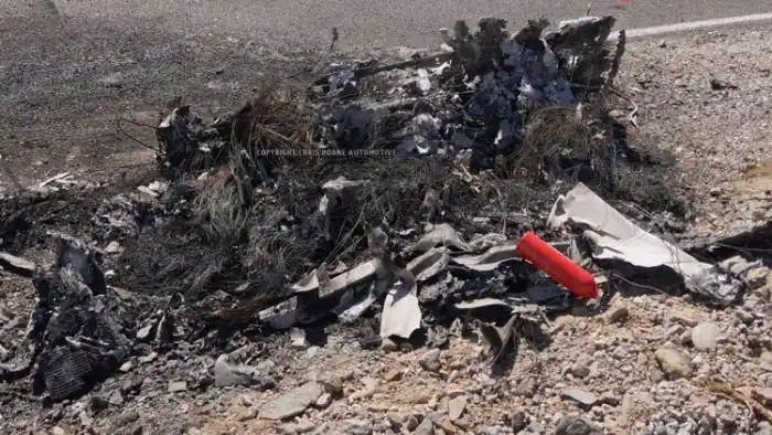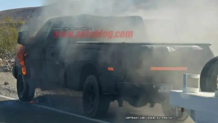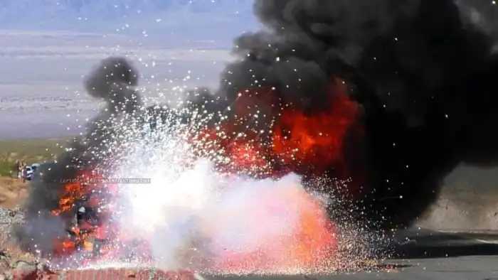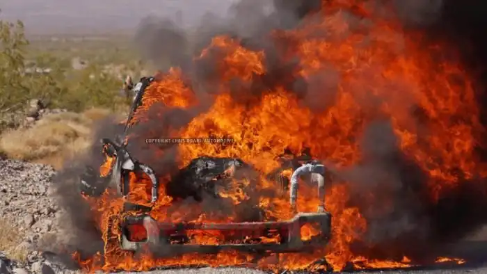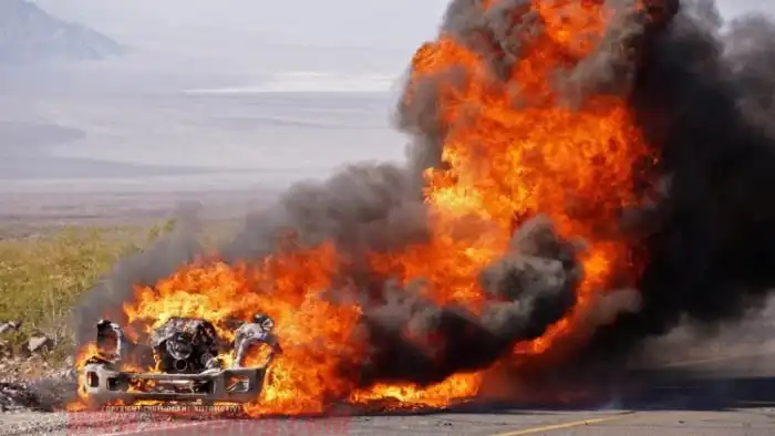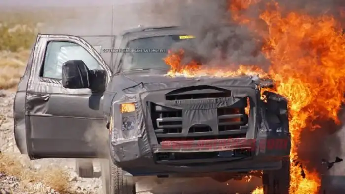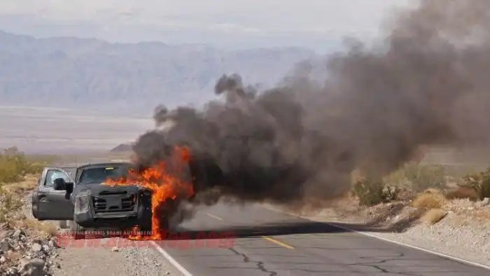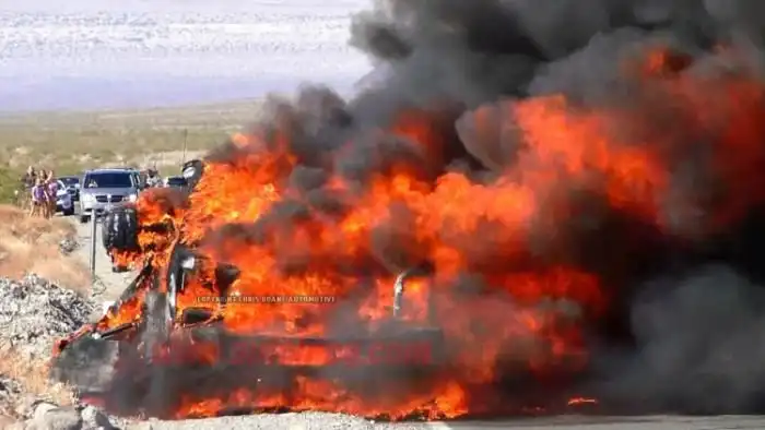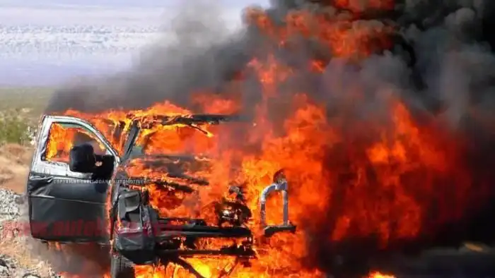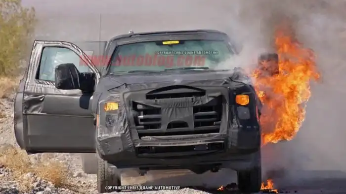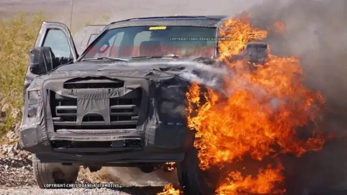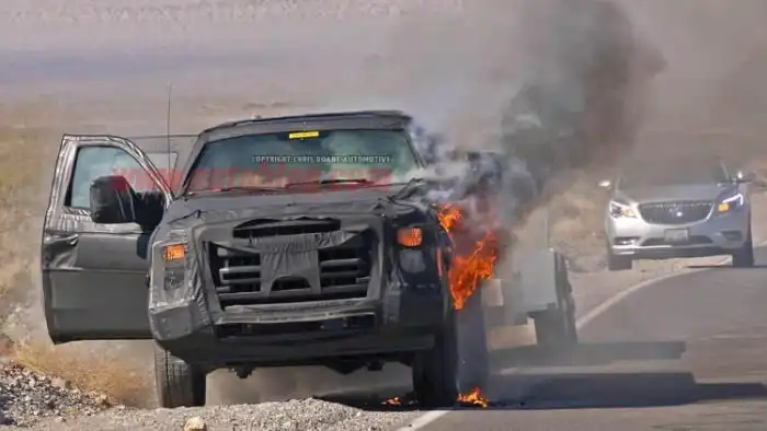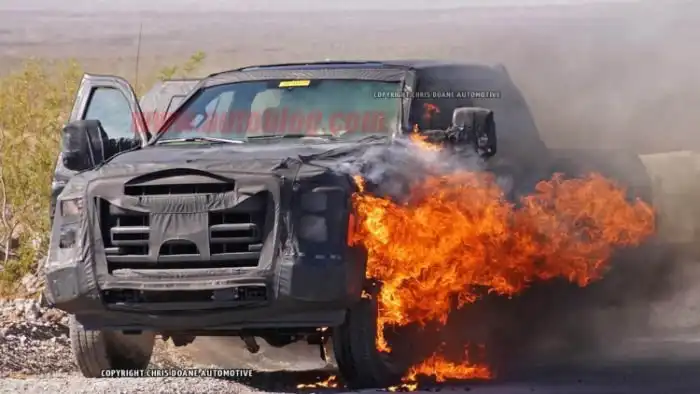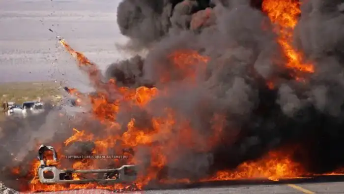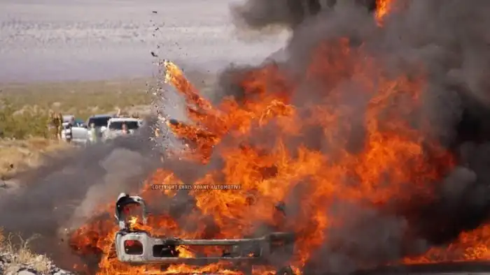 Испытания прототипов новых автомобилей является довольно опасным занятием, и эти фото служат ярким тому примером. Снимки были сделаны во время испытаний пикапа Ford F-Series Super Duty. Для испытаний выбрали безлюдную пустыню, а машину защитили от посторонних глаз специальным чехлом. В какой-то момент из-под капота пошел дым, а потом показалось пламя. Тестировавшие авто сотрудники компании «Форд» успели остановиться и выйти из пикапа, но потушить они его так и не сумели. Пламя перекинулось на чехол, после чего огнем был объят уже весь автомобиль. Спустя некоторое время произошел взрыв, а всего за 21 минуту прототип нового пикапа превратился в кучу пепла. Температура пламени оказалась настолько высокой, что многие детали кузова, изготовленные преимущественно из алюминия, попросту расплавились.