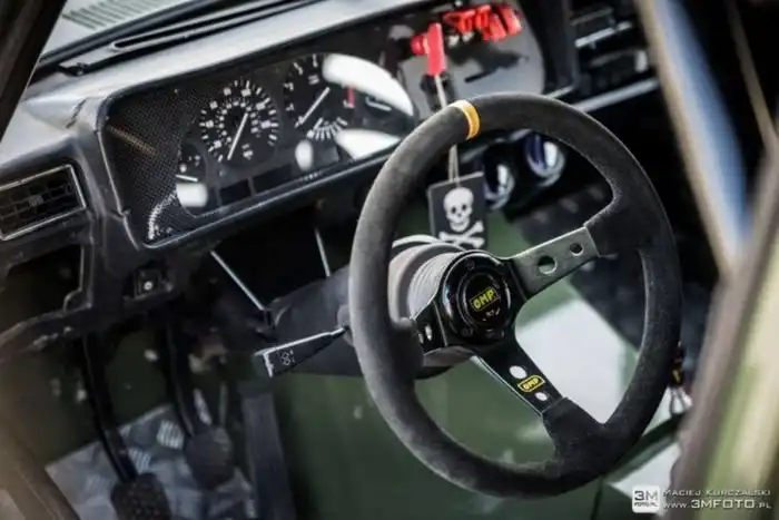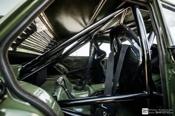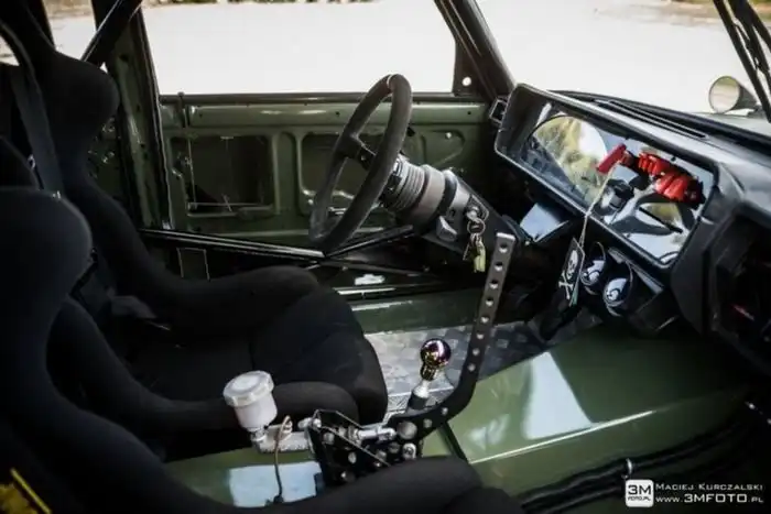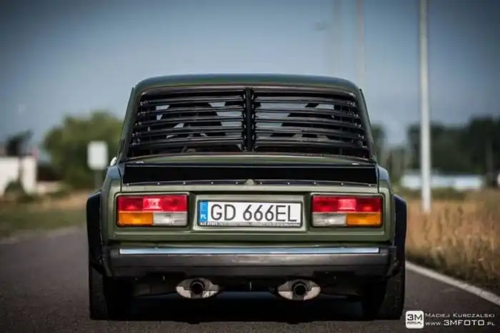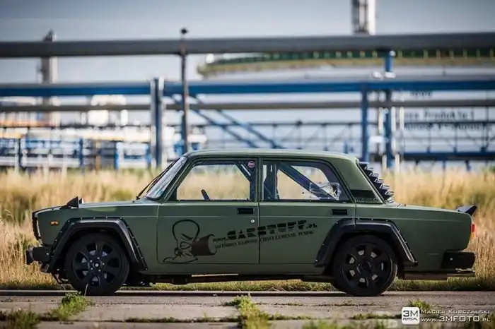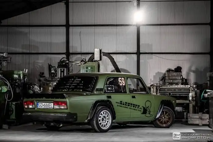 Польские умельцы превратили ничем не примечательный седан ВАЗ-2107 в идеальную машину для дрифта, оставив от стоковой модели практически один лишь только кузов. Матовый болотно-зеленый кузов с черными элементами обвеса делает авто визуально более агрессивным, как бы намекая на то, что с ним стоит считаться. И это действительно так, ведь под капотом машины находится могучий двигатель V8 от BMW. Гоночный болид также получил новую трансмиссию, спортивную подвеску и мощную тормозную систему. Из салона убрала все лишнее, включая элементы обшивки и задние сиденья. Теперь здесь находятся гоночный каркас безопасности, гоночные кресла и быстросъемный руль.