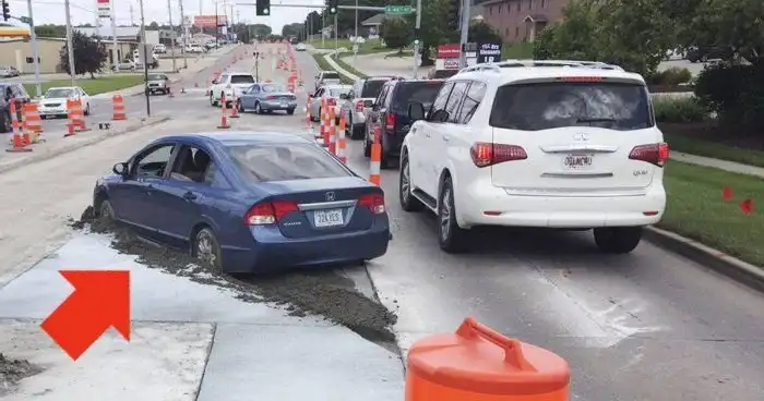 В городе Линкольн, штат Небраска, США, молодой водитель автомобиля Honda Civic сильно торопился и не мог ждать, поэтому он решил объехать пробку, невзирая на соответствующие информационные знаки. Однако знаки эти были установлены не просто так, а потому, что на данном участке дороги велись ремонтные работы. Выехав на соседнюю полосу, молодой человек угодил в бетонную ловушку. Это станет для парня хорошим уроком, так как данный маневр обошелся ему в 10 000 долларов.