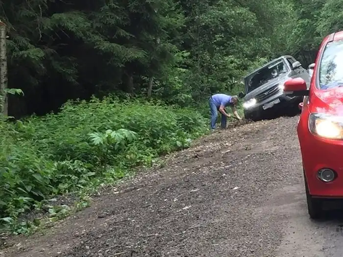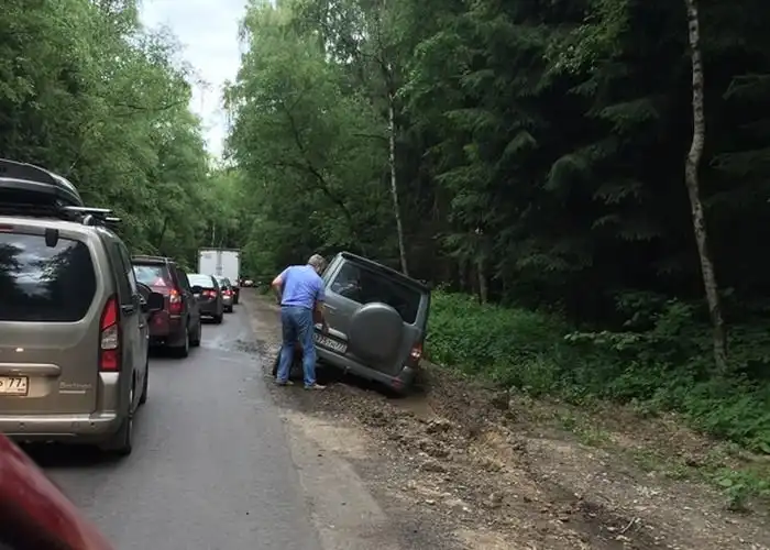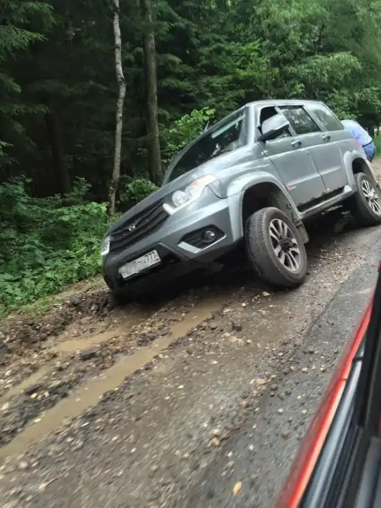 Думая, что он здесь самый хитрый, водитель этого автомобиля поехал по обочине, где попал в болото. Справиться с грязевой ловушкой не смог даже полный привод его внедорожника УАЗ «Патриот», а потому автомобилисту пришлось браться за лопату и выкапывать машину. Вряд ли потраченное на это время окупит те минуты, которые он хотел скоротать, двигаясь по обочине.
