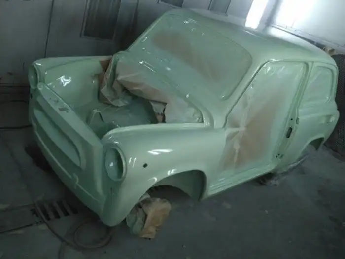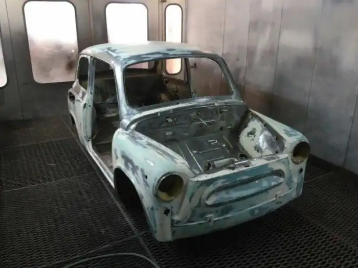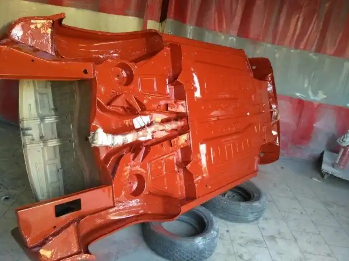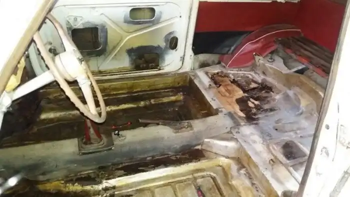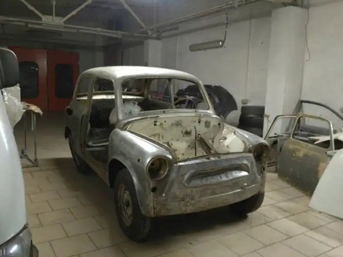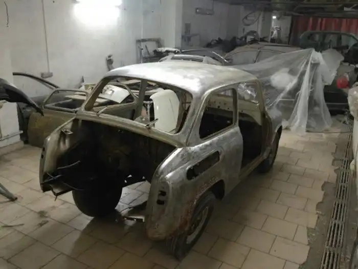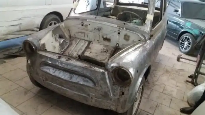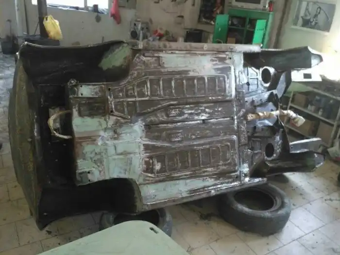 Уже снят мотор с кпп, печка, снят весь салон, стекла, потолок и тд.