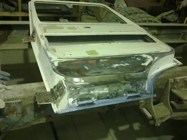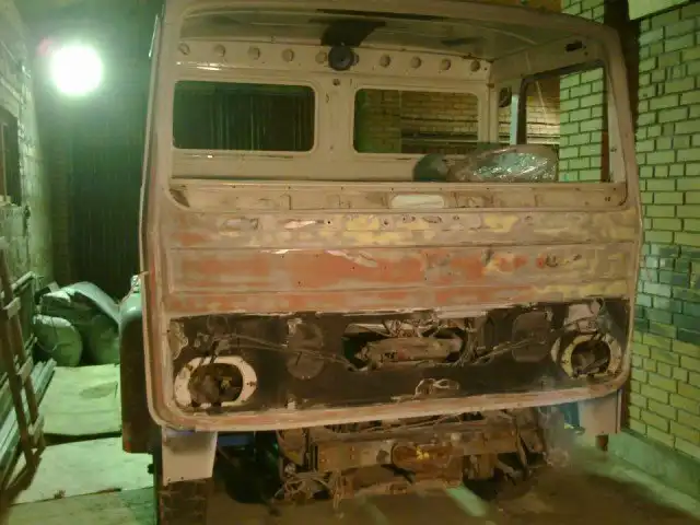 Затем приступили к ремонту кабины, переварили пол с водительской стороны, изготовили новую внутреннюю и переднюю стенку подножки, низ порога, всё сварили и обработали и почти тоже самое проделали с другой стороны. Далее перегнали грузовик своим уже ходом в покрасочную камеру, там то все загрунтовали, покрыли так же антикороззийкой и все это было сделано качество, затем покрашен в очень сочный и красивый цвет.