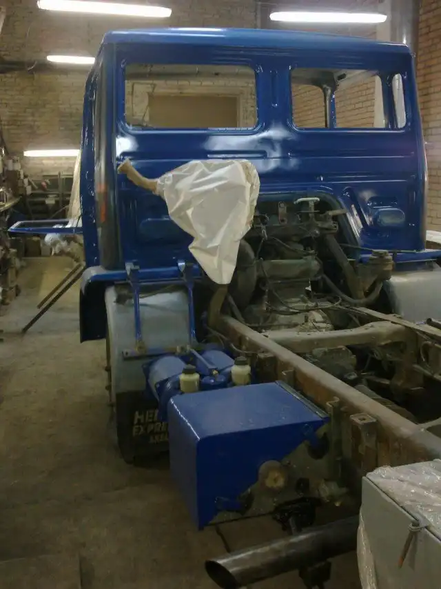 Первым делом была перебрана вся тормозная система (цилиндры, колодки, рессивер, полная переборка компрессора, замена регулировочного клапана на компрессоре, новые трубки), так же перебрали всю ходовую часть, покрасили бак, задний отбойник покрасили и заменили задние фонари и еще много чего по ходовой части.