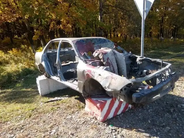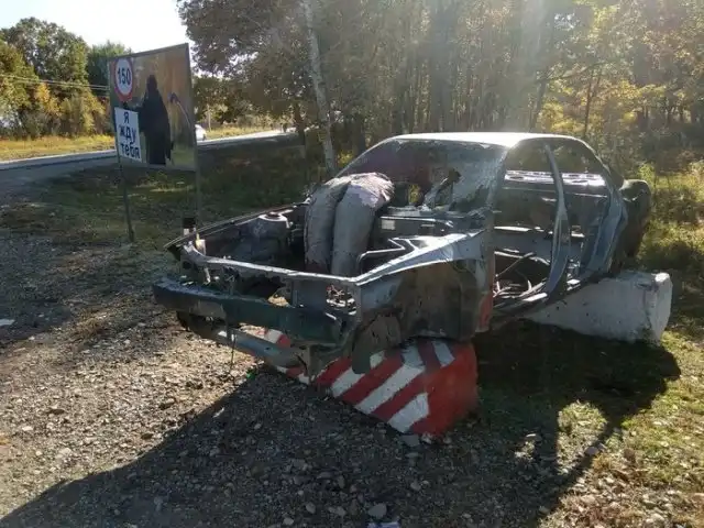 Примерно в 40 километрах от Хабаровска на трассе "Хабаровск - Комсомольск-на-Амуре" можно увидеть очень необычную "композицию". Эта инсталляция установлена возле мотострелковой бригады и на наглядном примере демонстрирует, почему не следует пренебрегать скоростными ограничениями на дорогах общего пользования. Смотрится, конечно, такая инсталляция весьма пугающе, зато действует на проезжающих мимо водителей безотказно - все сбавляют скорость.