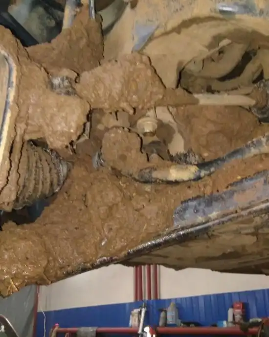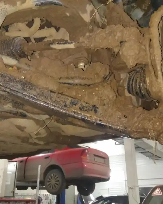 По его словам, он всего разок в луже застрял, но смог сам выбраться. Подняли машину на подъемника, а там такое...