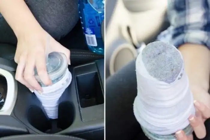 Обычный носок, надетый на питьевой стакан, вставленный в подстаканник, соберет на себя всю грязь.