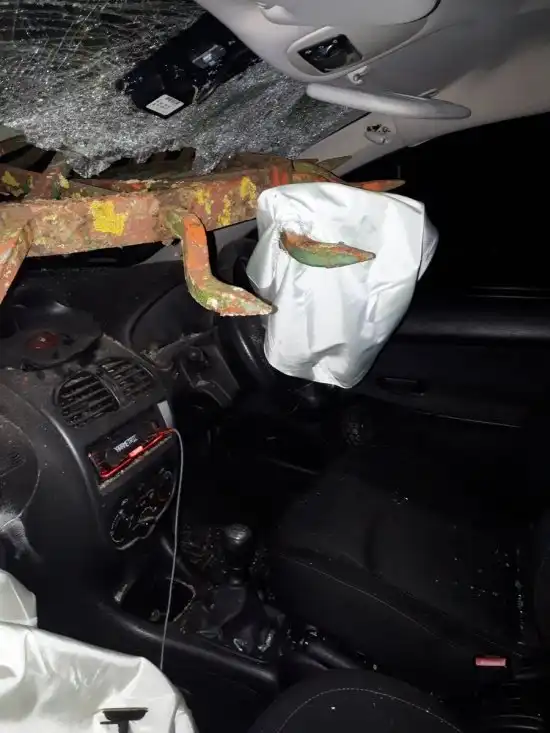 Эта необычная авария произошла в небольшой британской деревне под названием Линтон, а ее причиной стал гололед на дороге. Водитель не справился с управлением, поэтому автомобиль врезался в металлическую ограду, практически напоровшись на нее. Шипы прошли сквозь лобовое стекло и даже вспороли подушку безопасности, но к счастью, ни пассажир, ни водитель не получили серьезных травм. Как говорится, точно в рубашке родились.
