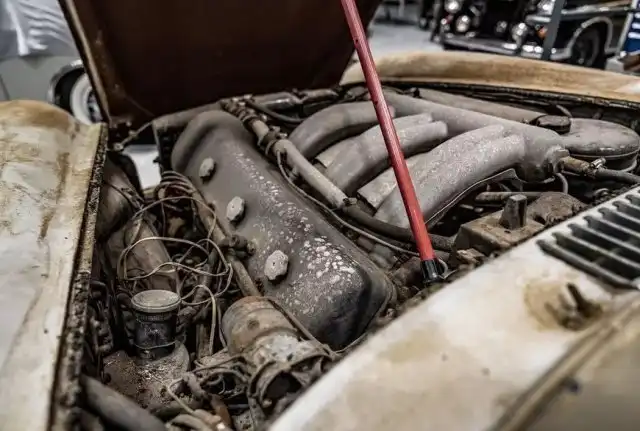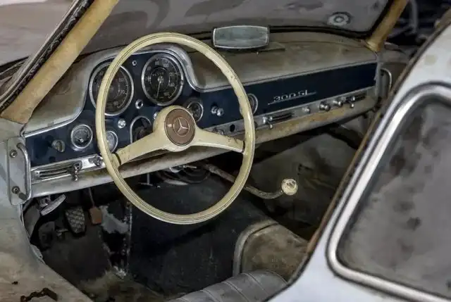 В калифорнийском центре классических автомобилей был выставлен необычный экземпляр - Mercedes-Benz 300SL Gullwing. Этот эксклюзивный автомобиль простоял в гараже более 60 лет и сохранился практически в первозданном виде. Владелец собирался перекрасить машину в конце 50-х годов прошлого столетия, поэтому с нее полностью сняли оригинальную краску. На "Крыло чайки" нанесли два слоя грунтовки и реставрация на этом остановилась.