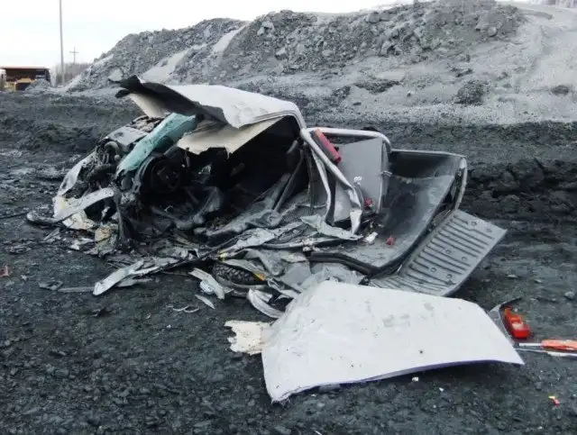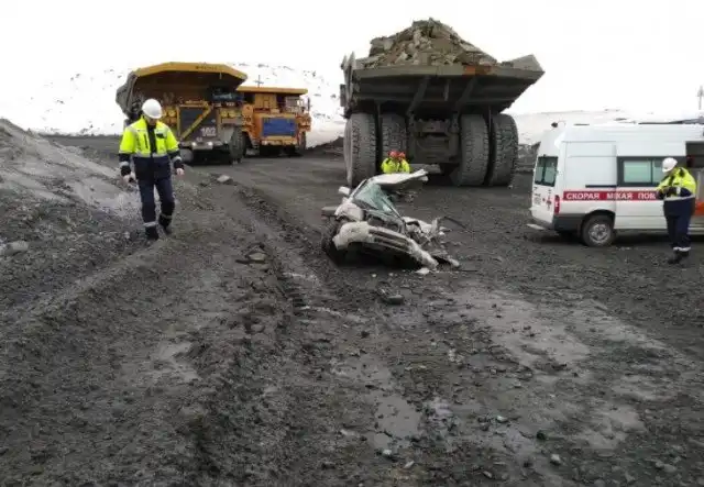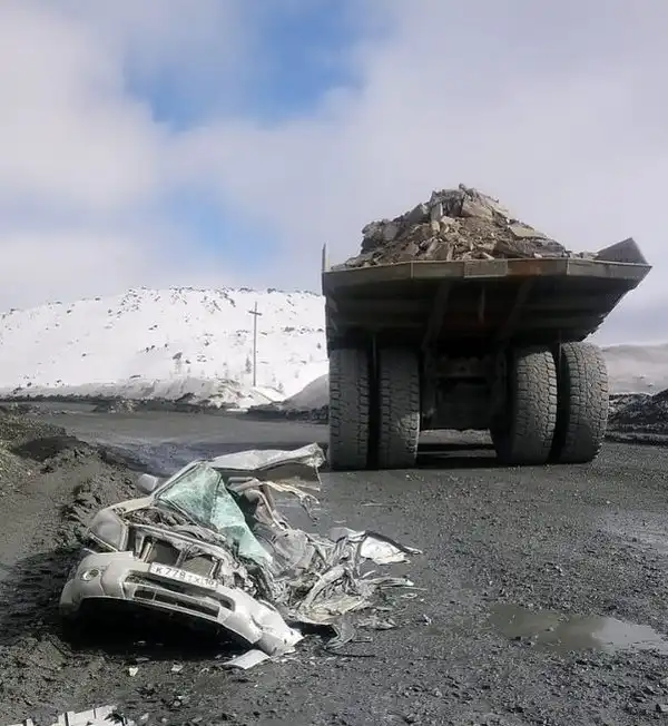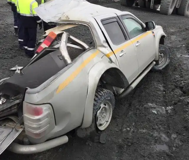 В карьере Южный "Карельского окатыша" произошла авария, во время которой автосамосвал в прямом смысле слова раздавил автомобиль Ford Ranger. К счастью, несмотря на то, что у пикапа практически не осталось водительской стороны, по которой проехал карьерный самосвал Caterpillar, водитель не только выжил, но еще и не получил никаких увечий.