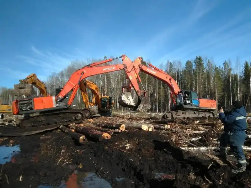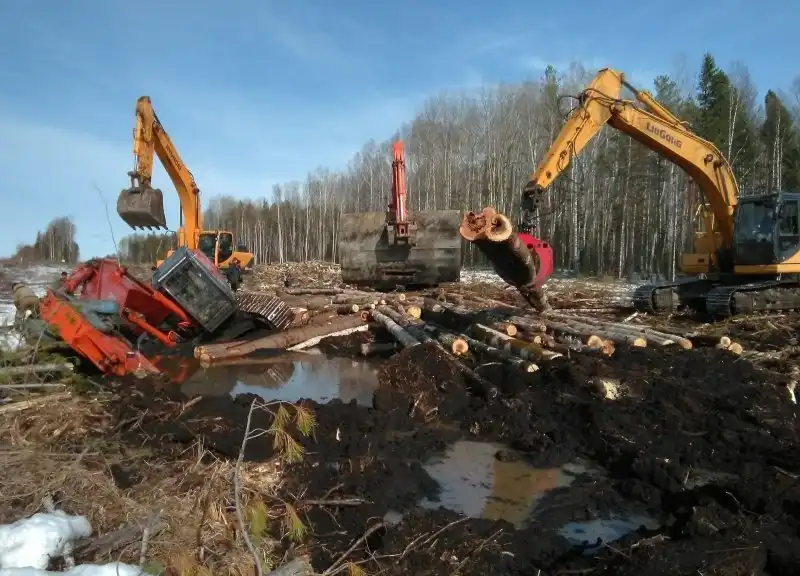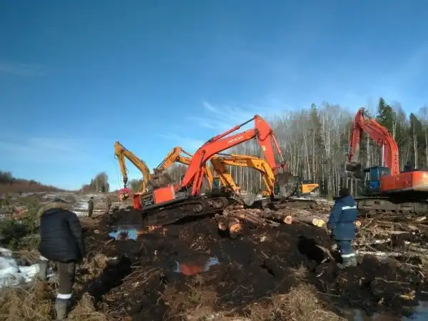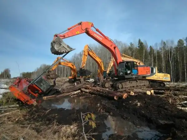 Не бросили товарища: экскаваторы спасают своего увязшего собрата