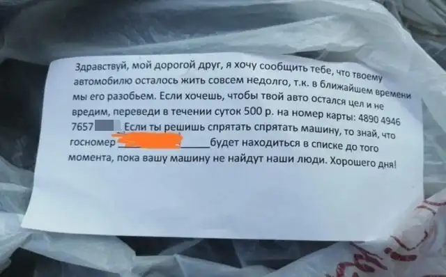В записке сказано, что если владелец авто не переведет определенную сумму на указанный счет, злоумышленники разобьют в машине все стекла.