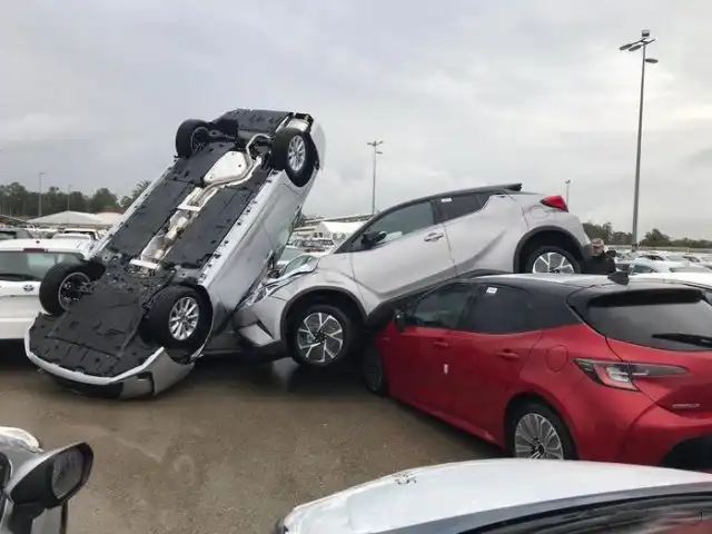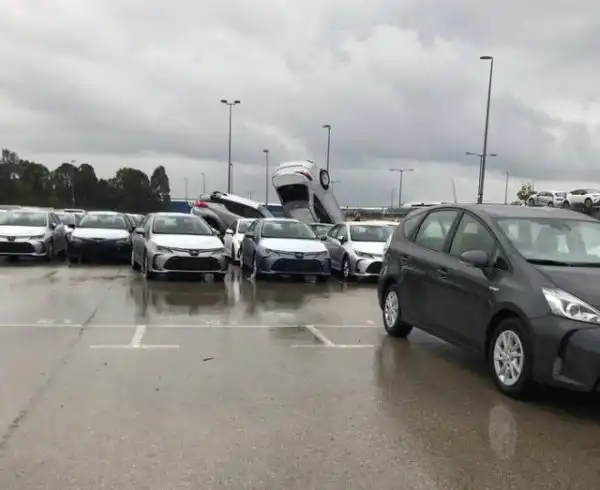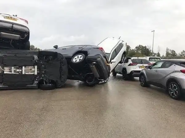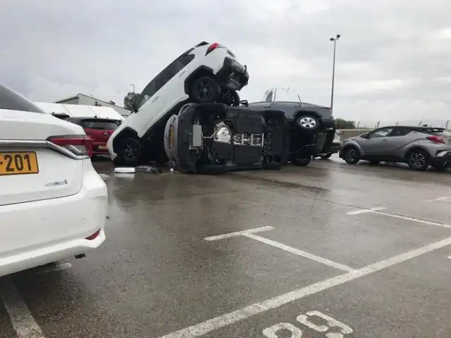 На одной израильской парковке очевидцы оказались шокированы увиденным. Но никто не мог пояснить, что там произошло. Непонятно, то ли Годзилла поиграл автомобилями футбол, то ли гигантский малыш играл в "машинки". Но расставить точки над "й" помогла запись с камеры видеонаблюдения.