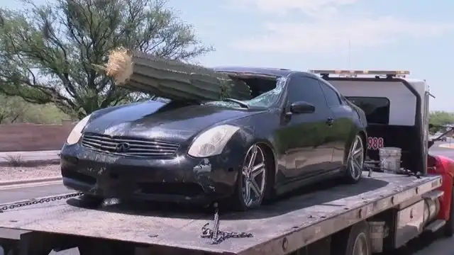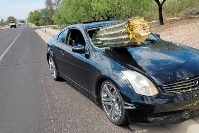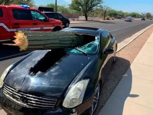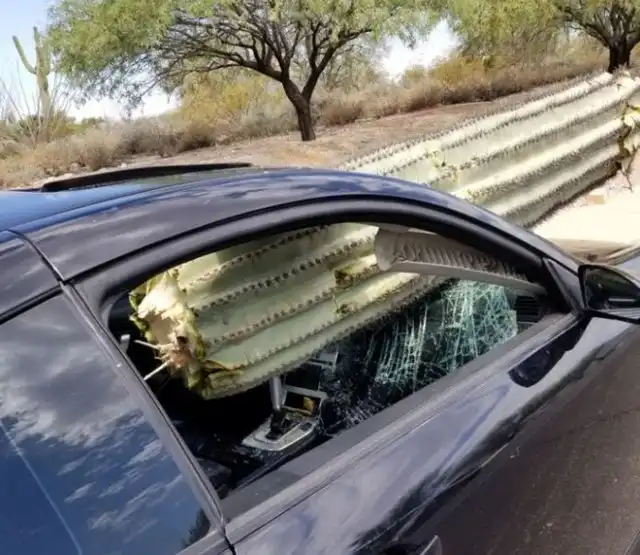 Из лобового стекла легкового автомобиля Infiniti торчал огромный "обломок" кактуса карнегия. Водитель не смог ничего объяснить, так как находился в состоянии сильного алкогольного опьянения.