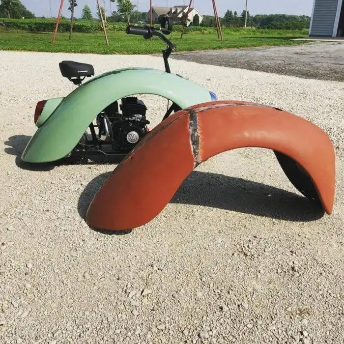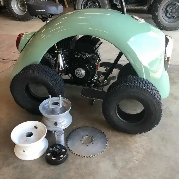 В его мини-мотоциклах Volkspods используется изготовленная на заказ мопедная рама с двигателем объёмом 79 куб. см, который мужчина вмонтировал в крыло классического «Жука». Байки оснащены велосипедным рулём, выполненном в ретро стиле, сиденьем, а также передним и задним фонарями. Уолтер создал мотороллеры двух цветов: берюзово-зелёного и пастельно-синего.