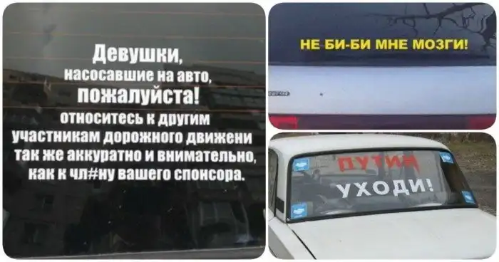 Иногда водители специально делают надписи или наклейки на авто, чтобы высказать свое мнение. Мы собрали философские, иногда бредовые и смешные тексты, подсмотренные на дорогах России. Зато есть, что почитать в пробах!