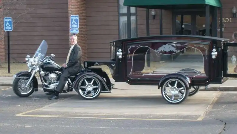 Катафалки, изготовленные из старых советских автомобилей, из спорткаров, из электрокаров... да даже из обыкновенных байков. На кладбище можно добраться в самых странных транспортных средствах.