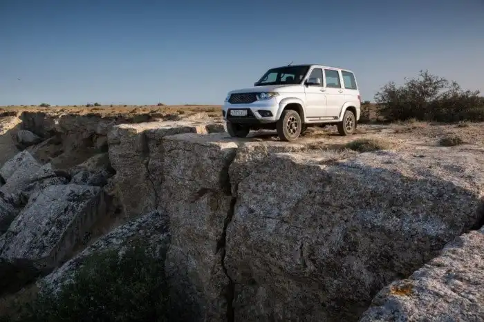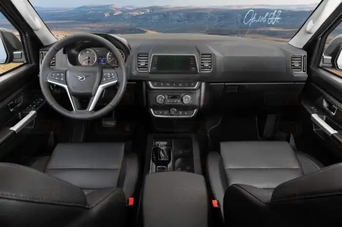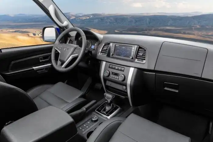 Пресс-служба УЗА отмечает, что салон будет также существенно обновлен. Передняя панель будет выполнена в современном дизайне с горизонтальным сенсорным экраном. На консоль выведет функцию подогрева руля, лобового стекла и передних сидений. Также там будет предпусковой подогреватель, передний парктроник, ESP, система помощи при спуске, off-road, кнопка управления режимами полноприводной трансмиссии.