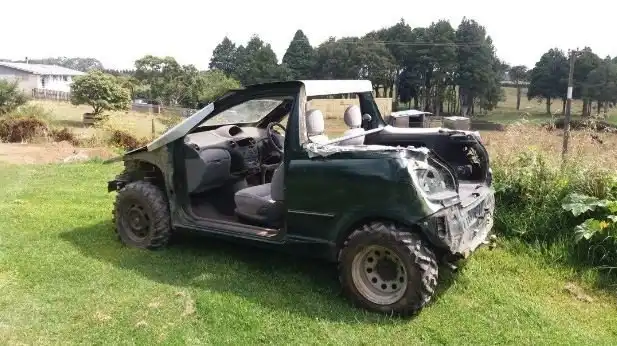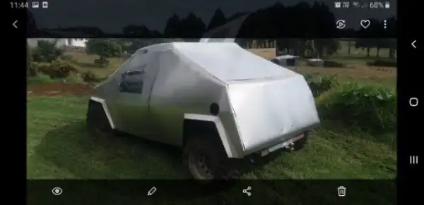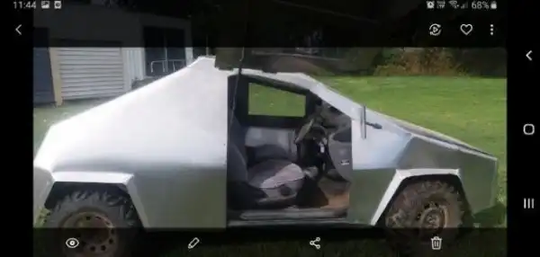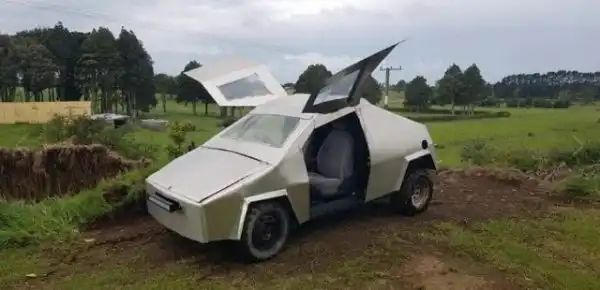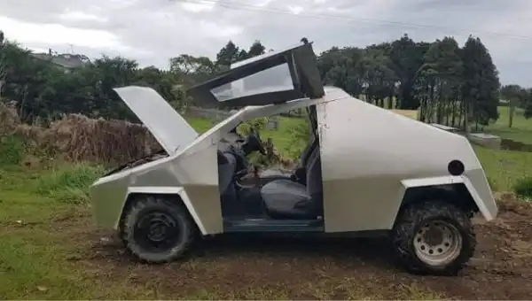Новозеландский инженер использовал разбитую версию старой Toyota. Стараясь повторить контуры пикапа Илона Маска, мастер использовал листовой металл, пластик, покрышки для внедорожника и даже двери, открывающиеся в стиле «крыла чайки». Что у него получилось — смотрите сами. К слову, машина была продана за 999 долларов. Правда, ездить по дорогам общего пользования на ней нельзя, поскольку нет никаких систем безопасности. Зато имеется светодиодная лента, заменившая передние фары. Как вам такая самоделка?