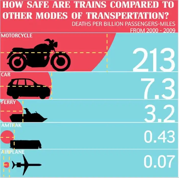 За десять лет, с 2000 по 2009 годы, «смертельность» авиаперелётов составляет 0.07 погибших на 1 миллиард пассажиро-миль. Для поездов этот показатель равняется 0.43, для морских паромов – 3.2, для автомобилей – 7.3, а для мотоциклов – 213.