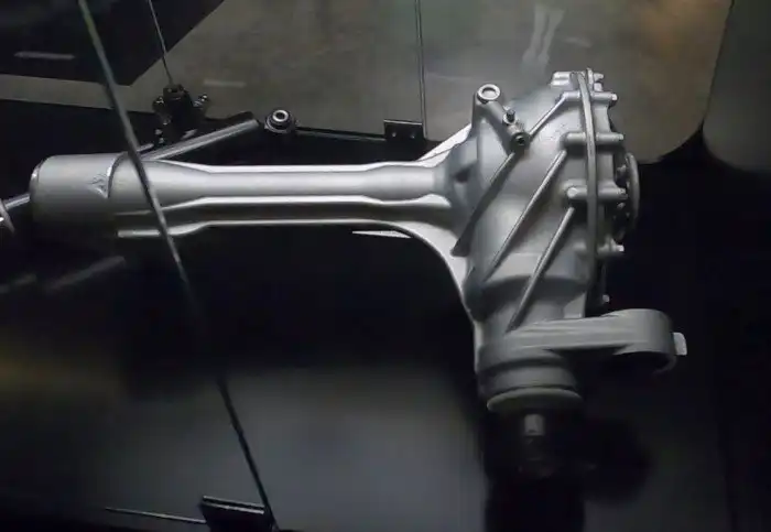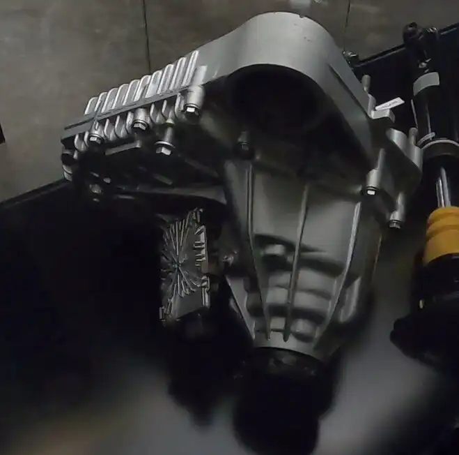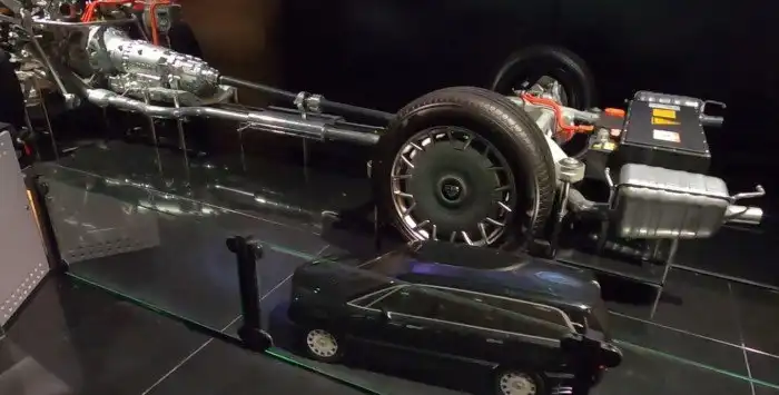 Схема ЕМП следующая. На переднем подрамнике стоит полностью алюминиевый V8 с двойным наддувом. Далее идет 9-ступенчатая коробка, но не сразу, а через электрический модуль, о нем чуть позже. С коробкой состыкована полноценная раздатка передающая крутящий момент на передние и задние колеса в постоянном режиме. Сзади мощный подрамник, над которым стоит тяговая батарея. Подвеска естественно полностью независимая. А теперь по порядку.