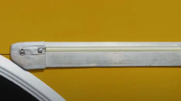 А под рукой у него было много чего. Не секрет, что советские автобусы внутри и снаружи отделывали так называемыми молдингами или кантами. Они изготавливались из алюминия и прикручивались шурупами. Так вод эти молдинги можно было разделить на два вида: те что с пластиковой вставкой, и те что без неё. На фото выше показан молдинг передней колёсной арки автобуса, и как можно видеть, там есть желобок для вставки из пластика. Однако сам молдинг прикручен, а вот пластиковая вставка ушла.