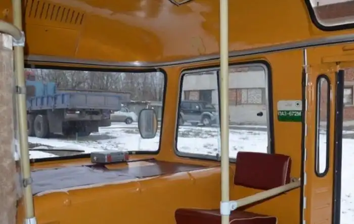 Идём в очередной ПАЗ и видим здесь внутренний молдинг со вставкой из чёрного цвета. А вот что касается красного пластика, то вообще непонятно, где они его взяли, потому что это была большая редкость.