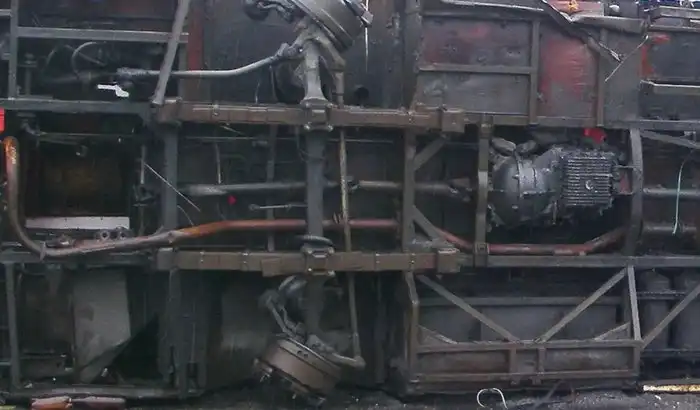 Чтобы ответить на этот вопрос, нужно пройти к самому ЛиАЗу. Вот собственно и он. Лежит на боку, правда уже без двигателя. Но давайте представим, что V8 у него на месте, по центру в передней части. Итак, что же мы тут видим?
