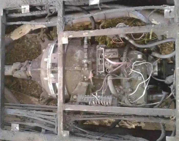 А видим мы здесь, как гидромеханическая коробка передач значительно отдалена от самого двигателя. Она вынесена в базу и находится между передним и задним мостом. Соединяется её первичный вал с валом двигателя аж через два карданных вала. Видели когда-нибудь такое?
