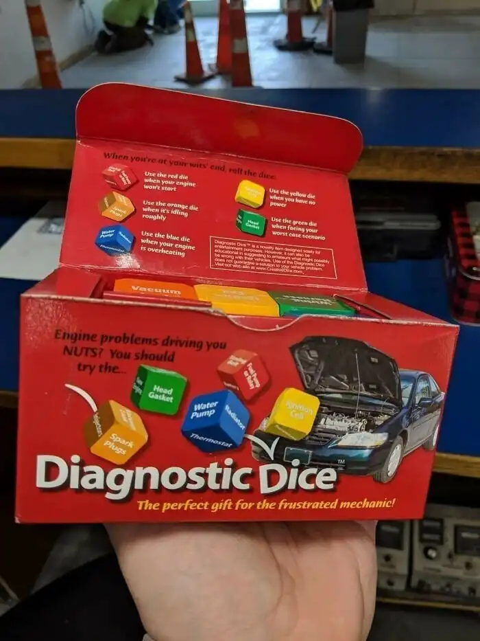 "Когда здравые идеи кончились, мы используем этот диагностический набор. Что выбросят кубики, то и чиним. Шутка"
