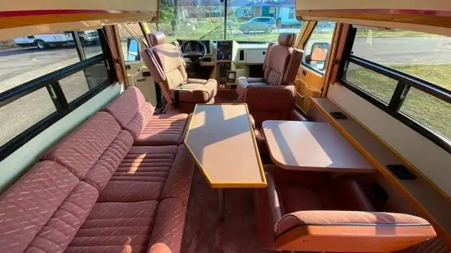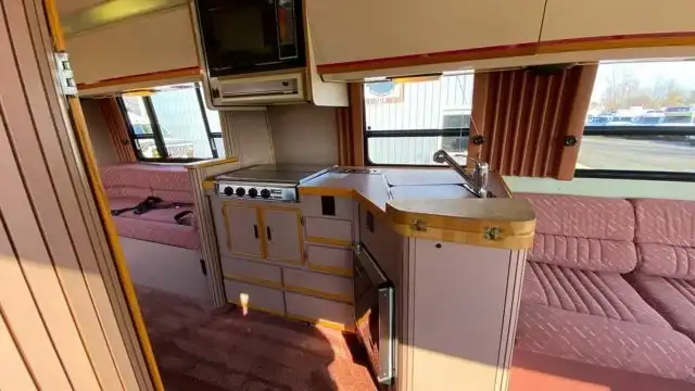 Есть и обеденная зона. А кухня оборудована всем, что понадобится для приготовления еды — газовой плитой, духовым шкафом, микроволновой печью, мойкой, вытяжкой, холодильником, блендером и даже генератором льда. Если же посмотреть на фотографии, то в салоне можно найти еще и телевизор со стареньким магнитофоном.