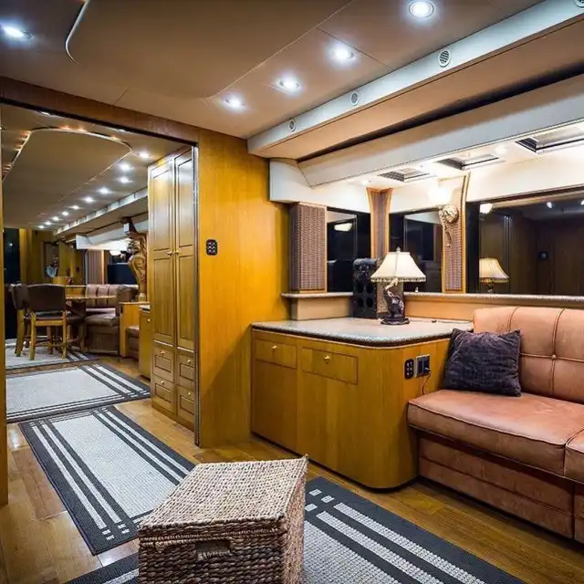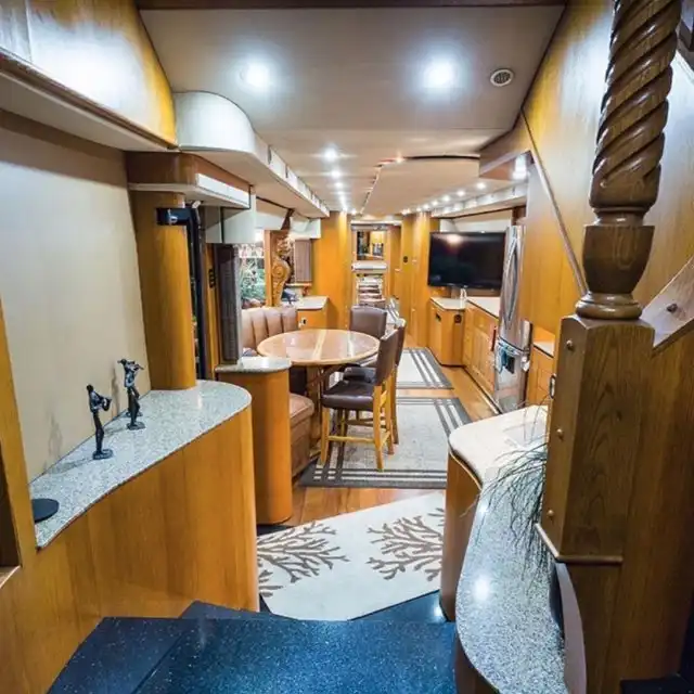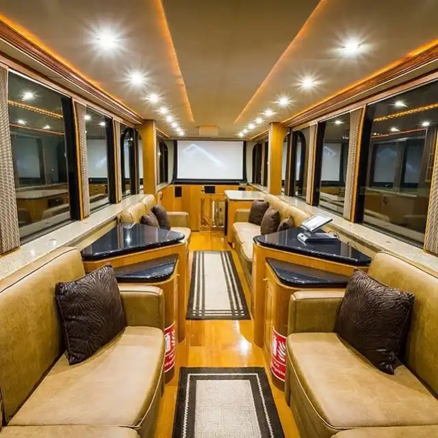Всего каких-то 150 миллионов рублей и вы смогли бы тоже позволить себе шикарный автобус с двумя комнатами, душем и ванной комнатой. Кроме того, можно трансформировать домашний кинотеатр. Кстати, есть и второй этаж - там помещается до 30 человек.