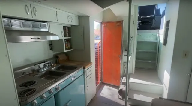 Поднимаемся по лесенке и заходим прямо в дверной проём. Здесь у нас сразу же кухня. Она оснащена всем необходимым. Варочная панель электрическая. Также есть двойная мойка и вытяжка.