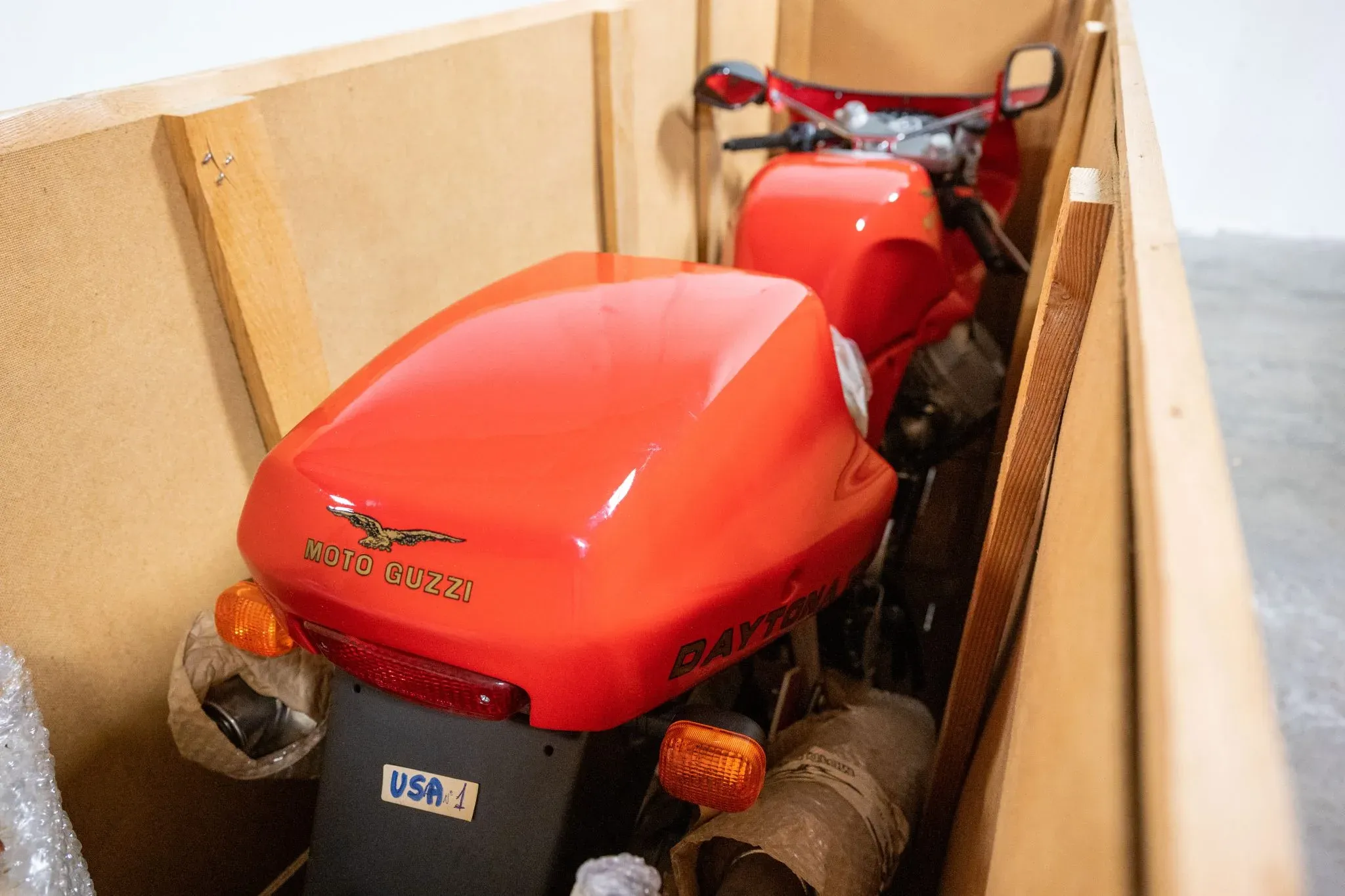 Выставленный на продажу экземпляр окрашен в алый цвет и оснащён единственным сиденьем, отделанным серой кожей. К байку прилагается даже гарантийный талон. Daytona 1000 выпускался с 1992 по 1999 год. Модель называют ключевой для марки в конце XX века.