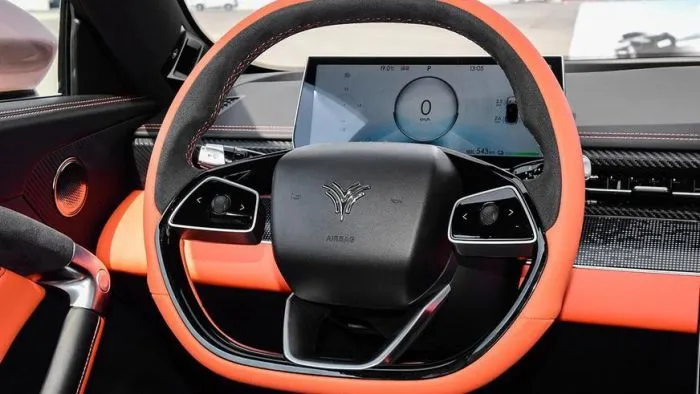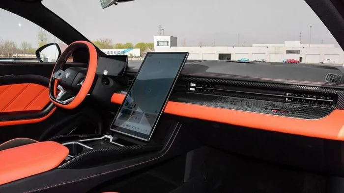 У передних кресел нарочито спортивный профиль и интегрированные подголовники, интерьер отделан кожей и карбоном. Neta GT укомплектовали двумя экранами и рулевым колесом, усечённым снизу и сверху.