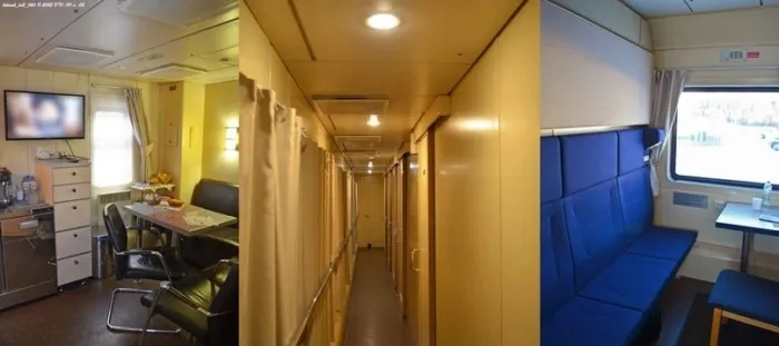 Как "членовозы" выглядят внутри? В сети можно найти несколько фото. Как правило, в поезде присутствует конференц-зал, душ, кухня, купе для отдыха и просторная кабина для осмотра путевого и станционного хозяйства.