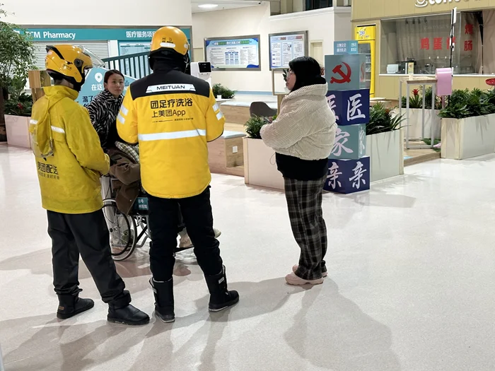 После этого мы направились в больницу - справиться о здоровье наездника скутера. В больнице уже были представители его работодателя - доставка еды Meituan - они оплатили медобследование. Ему уже сделали снимки ноги и руки. Ничего кроме ушибов не нашли. Ну и слава Богу. Вот мы в больнице, раненый сидит в инвалидном кресле, на всякий случай: