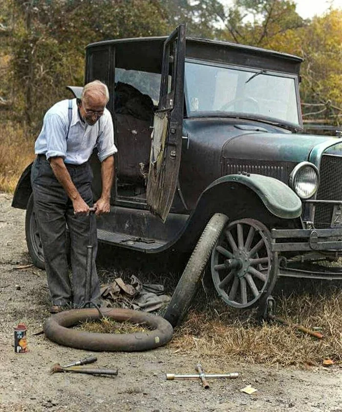 Мужчина меняет шины на Ford Model T Coupe 1927 года выпуска.