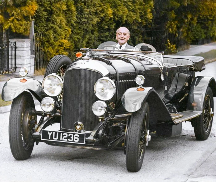 Легендарный английский инженер Уолтер Оуэн Бентли на своем Bentley 1927 года выпуска.
